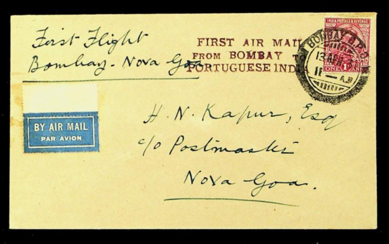 India 1929 First Flight Bombay to Portuguese Nova Goa cachet airmail cover (Image)