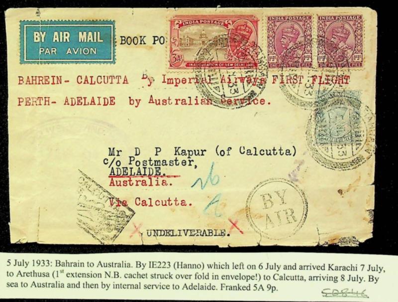 India 1933 KGV 4v Imperial Airways Airmail FFC from BAHRAIN via Karachi/ Calcutta to Adelaide Australia - Very Rare (Image)