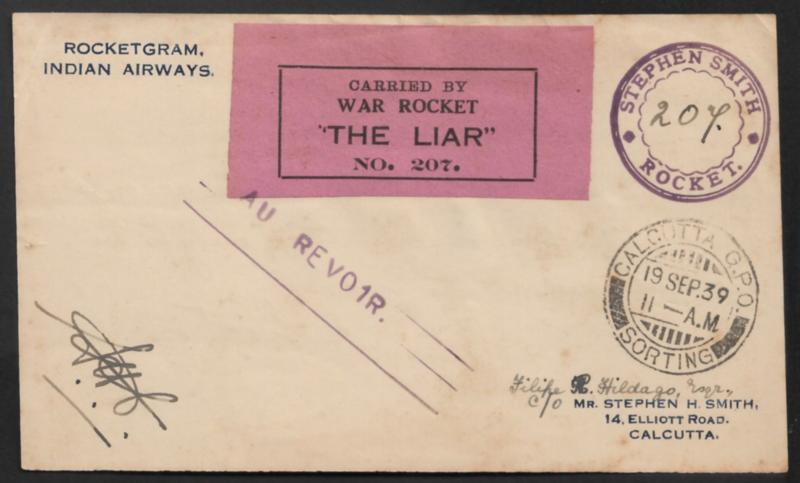 India 1939 War Rocket "The Liar No. 207" signed Rocketmail w/ Stephen Smith hand written message at back (Image)