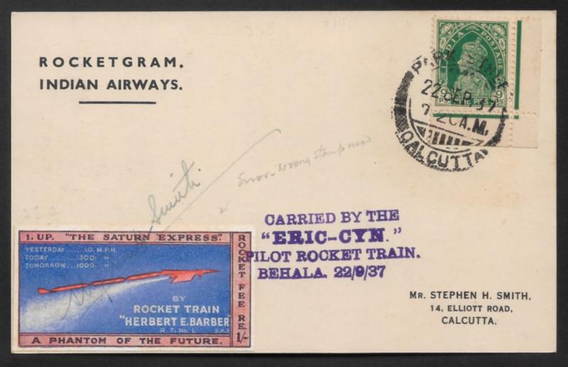 India 1937 Very Rare "Eric Cyn" signed Rocket card with wrong stamp used - Hand note by Stephen Smith (Image)