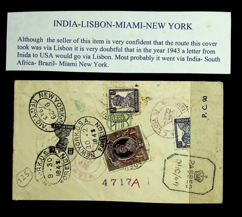 India 1943 WWII KG VI 4v on Censored Regd airmail cover to USA via Lisbon Portugal w/ scarce cachet (Image)