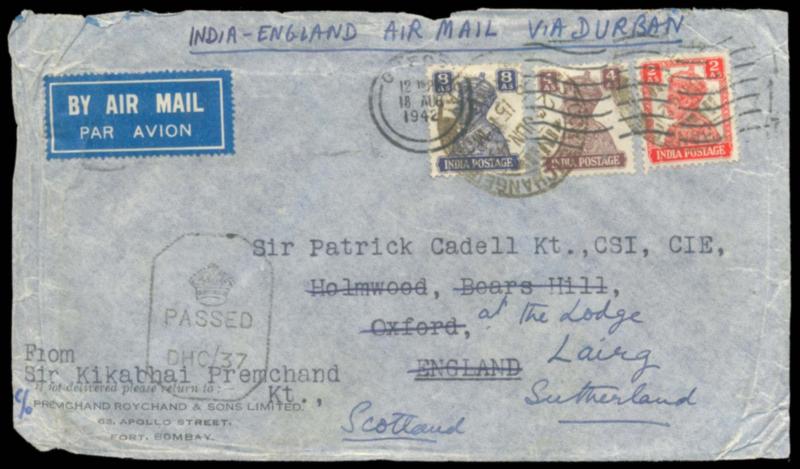 India 1942 WWII KGVI 3v on censored airmail cover from Bombay via Durban South Africa to England redirected to Scotland (Image)
