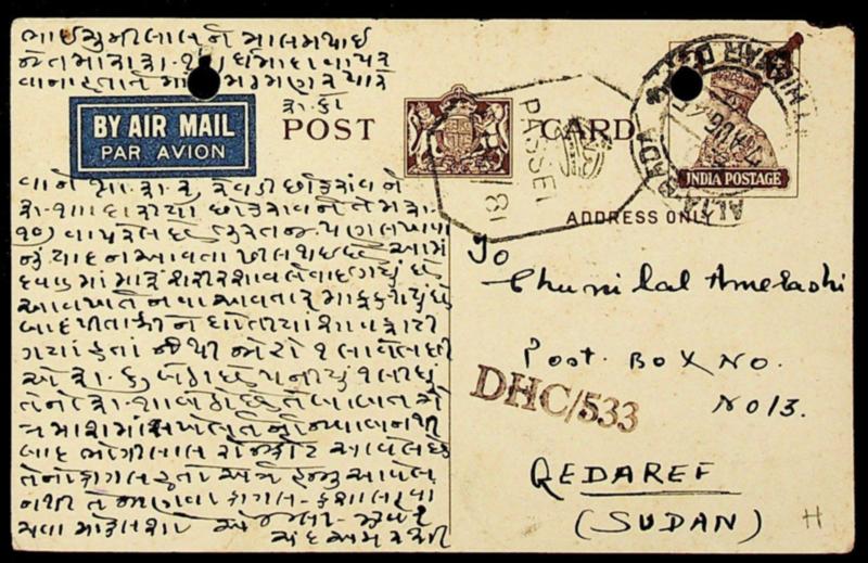 India 1945 WWII KGVI censored airmail postcard to Qedaref Sudan (Image)