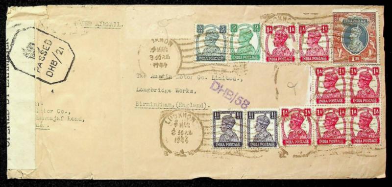 India 1944 WWII KGVI 3ps to 1R on censored airmail cover from Lucknow to Birmingham England (Image)