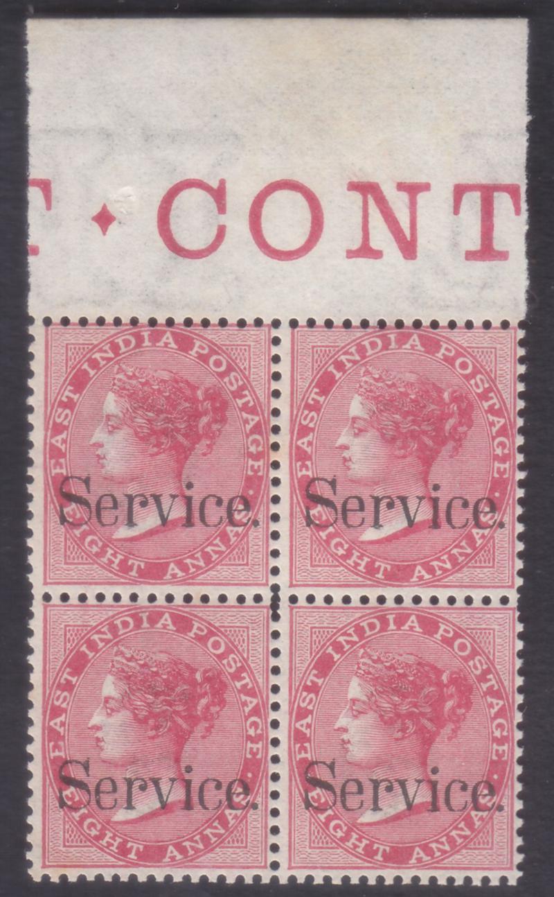 East India 1868 Officials 8as Rose Die II w/ salvedge at top MNH (LH on top margin only) SGO30 £32 very scarce positional block (Image)