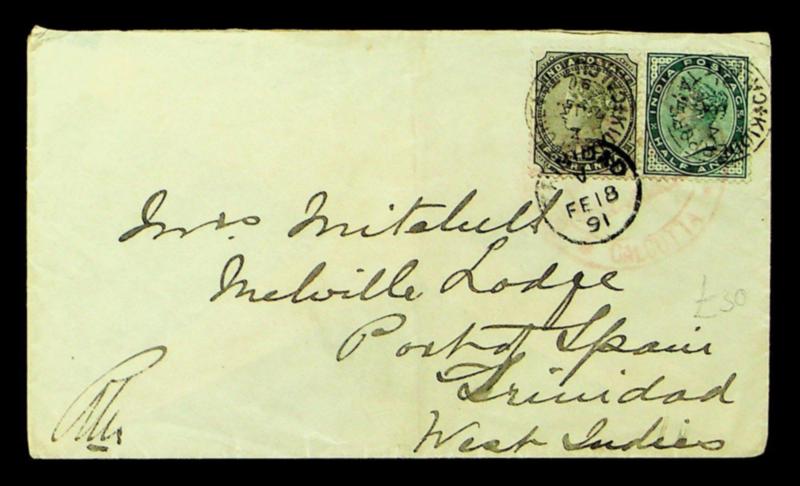 India 1891 QV 2v on cover from Kidderpore, Calcutta to Trinidad West Indies - Very rare destination (Image)