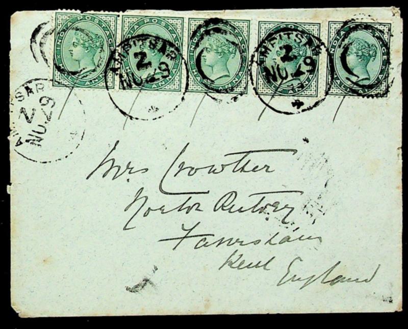 India 1893 QV ½ax5 on cover w/ Experimental cancel from Amritsar via Bombay to Faversham England (Image)