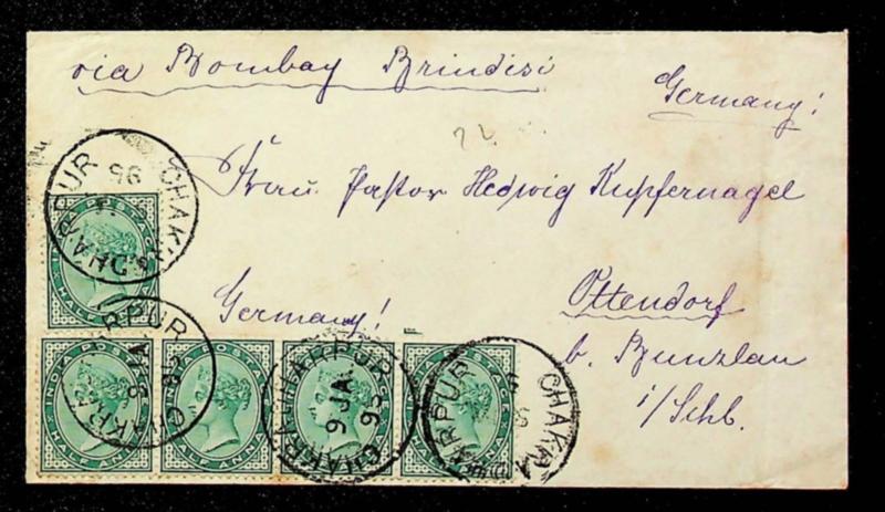 India 1896 QV ½ax5 Largest Known usage on cover from Chakradharpur (Orissa) via Bombay/ Sea PO/ Brindisi Italy to Ottendorf Germany (Image)