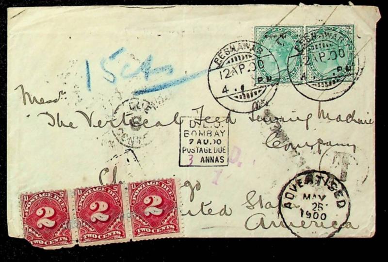 India 1900 QV ½ax2 on Taxed cover from Peshawar to USA w/ Postage Due 2cx3, bearing "DLO/ Bombay/ Postage Due/3as" & b/s w/ "DLO" & other pmks (Image)