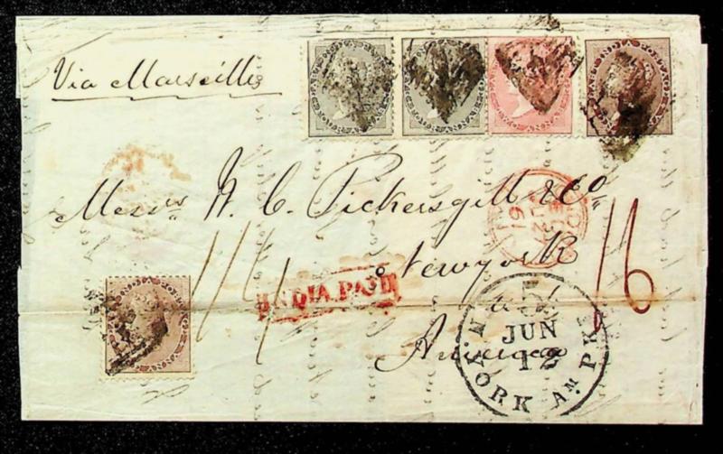 India 1861 QV 5v on cover w/ red boxed INDIA PAID" cachet via London UK/ Marseille France to New York USA (Image)