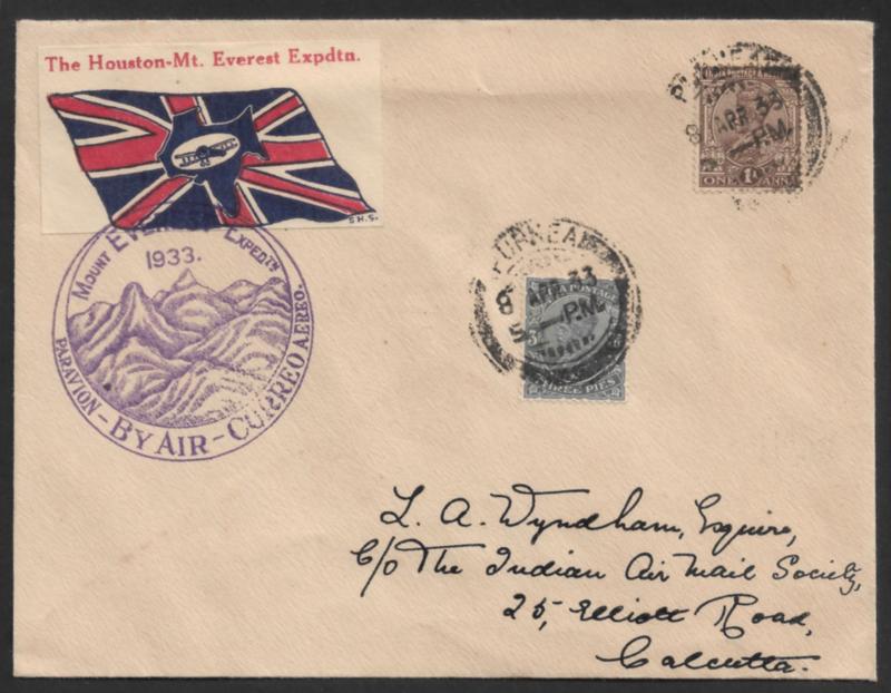 India 1933 Mount Everest Houston Expedition label with Union Flag 2v on cover from Purnea to Calcutta w/ sheet selvedge at back, Smith signed - Rare (Image)