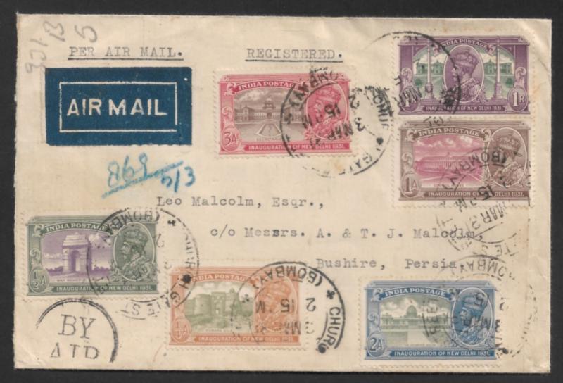 India 1931 Inauguration of New Delhi complete 6v set ONLY KNOWN Registered Airmail cover from Bombay to Bushire Persia Iran - Extremely Rare (Image)