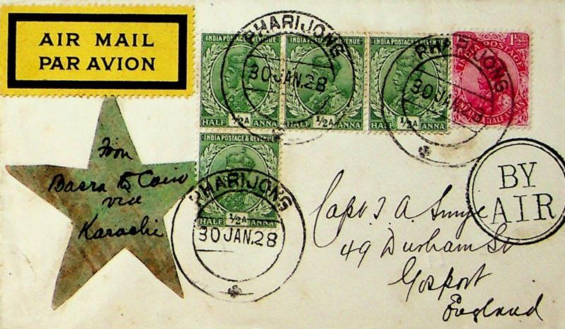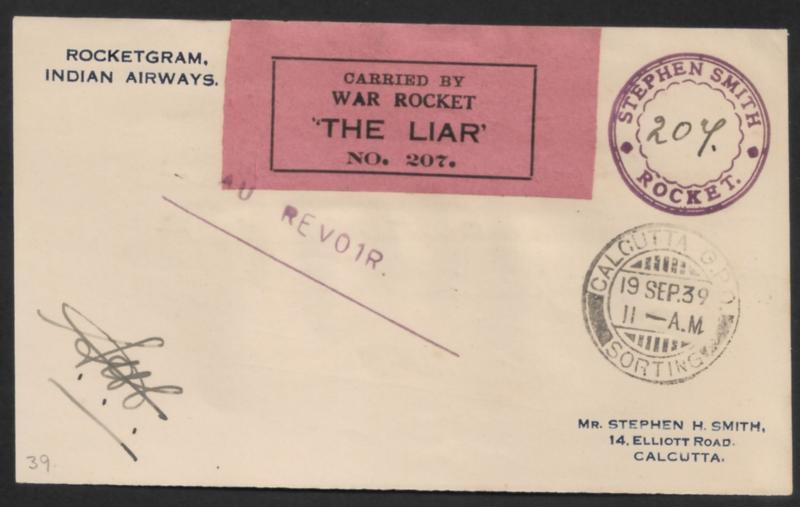 India 1939 AU REVOIR, Carried by the War Rocket "The Liar No. 207" Superb signed cover with message at back (Image)
