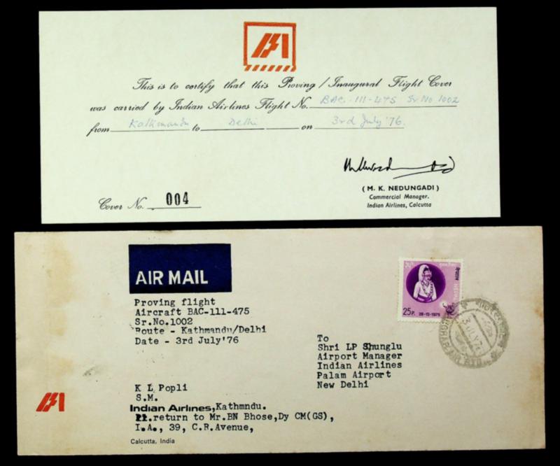 Indian Airlines 1976 25p on BAC-111-475 "Proving Flight" Airmail Certified cover from Kathmandu Nepal to New Delhi (Image)