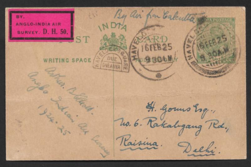 India 1925 KGV Rare Anglo Indian Air Service card from Havelock Square Calcutta, One Anna Due cachet, addressed to Raisina Hills Delhi, signed by Arthur B. Elliot and Stephen Smith (Image)