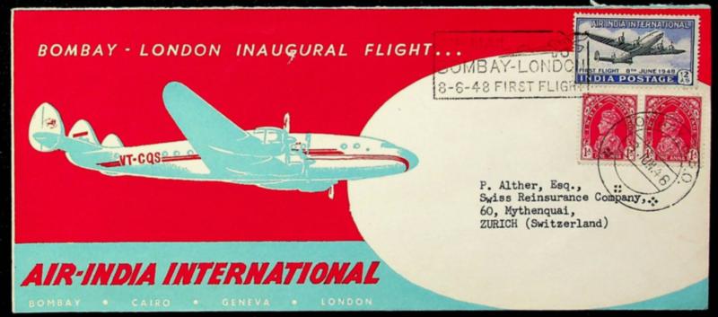 India 1948 3v on Bombay-London UK Inaugural Flight cover via Geneva to Zurich Switzerland w/ "Motor Boats World Championship" cachet at back (Image)
