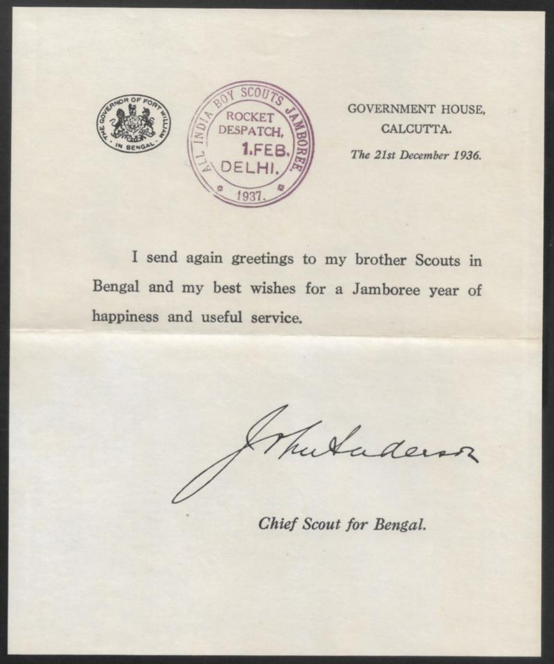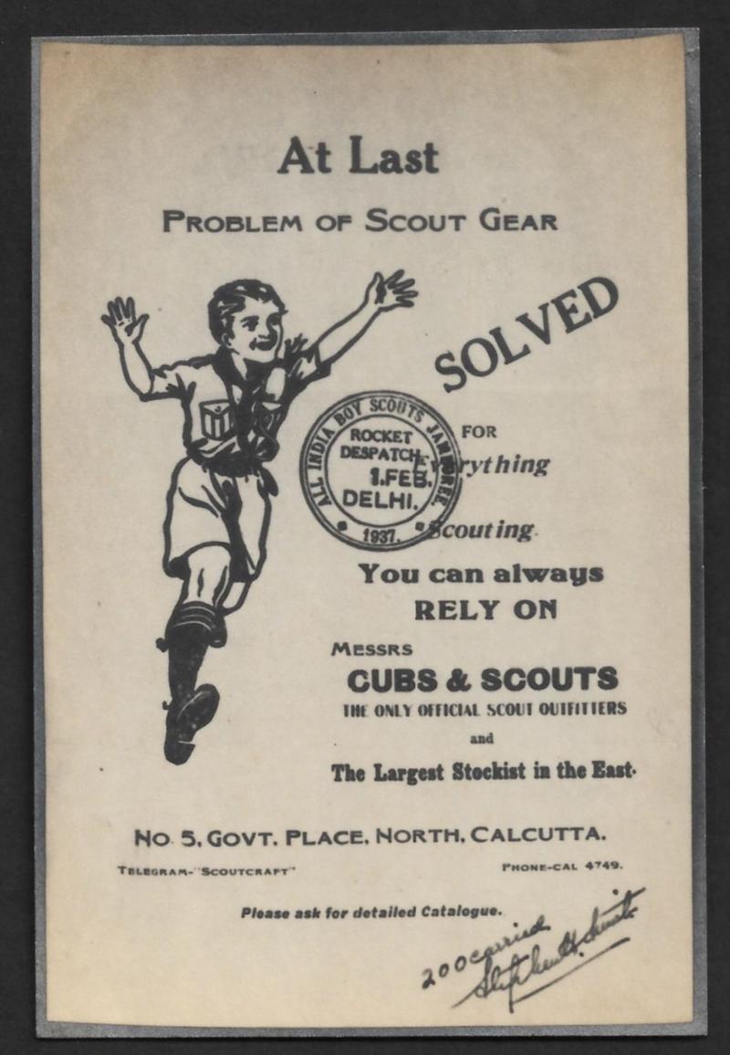 India 1937 All Boys Scouts Jamboree cachet signed by Stephen Smith & Chief from the Governor House Calcutta Bengal flown via Rocket Dispatch on 1st Feb (Image)