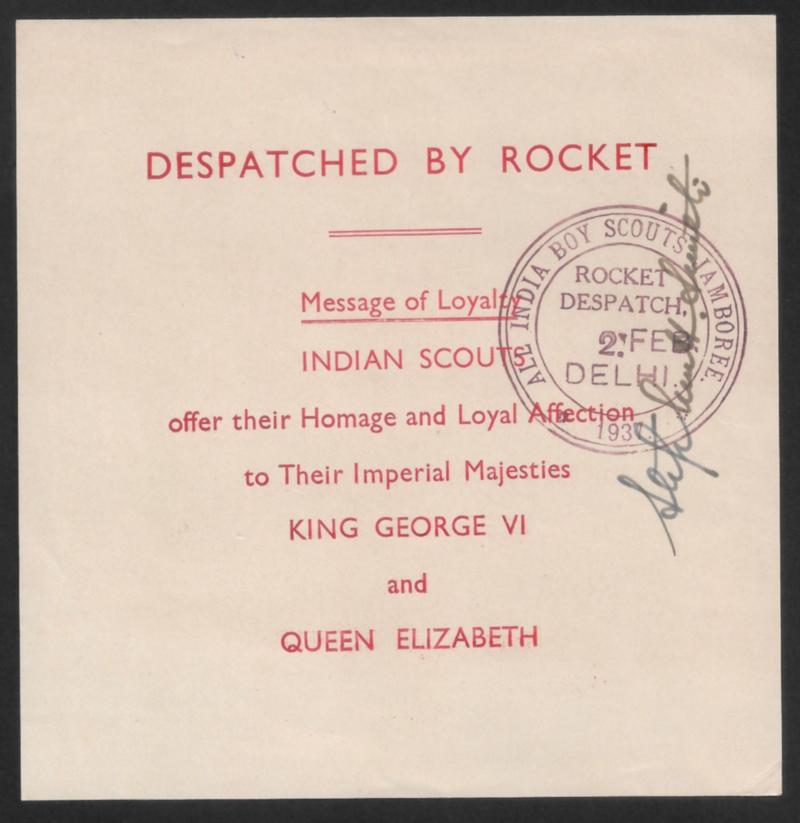India 1937 All Boys Scout Jamboree Rocket Dispatch paying their homage to Their Imperial Majesties KGVI & Queen Elizabeth - Superb! (Image)