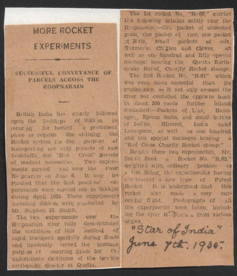 India 1935 "The Star of India" original newspaper cutout of the Successful Rocket Mission carrying the parcels & Red Cross Supplies across the River ROOPNARAIN in Sikkim by Stephen Smith - Rare (Image)