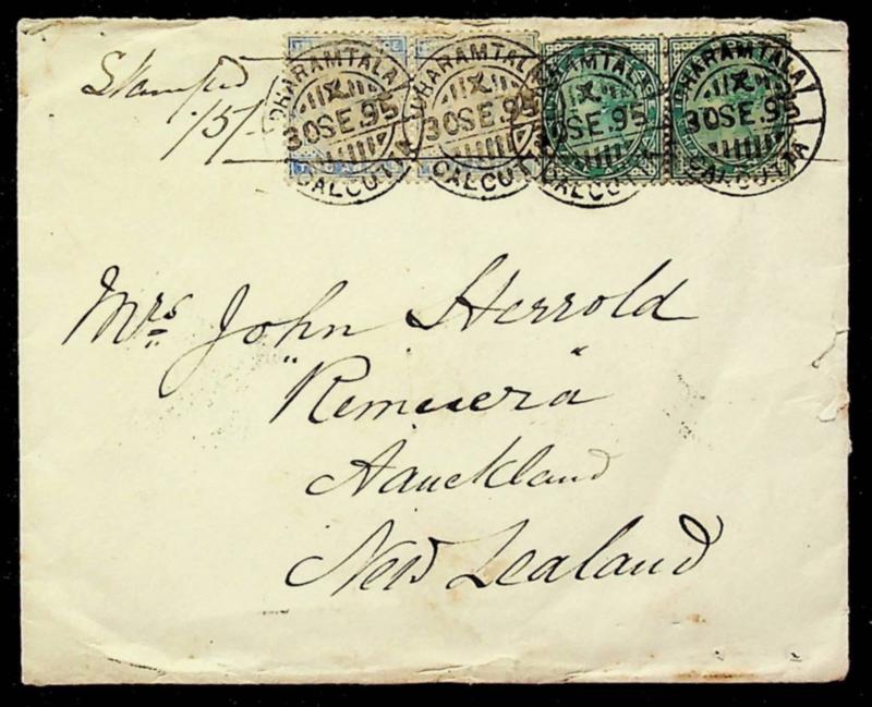 India 1895 QV 4v cover from Dharamtala Calcutta via train to Tuticorin and by ship to Colombo Ceylon & then to Auckland New Zealand - very rare destination (Image)
