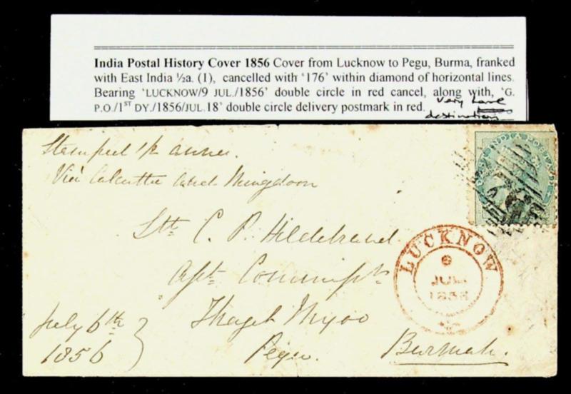 India 1856 QV ½a on cover cancelled with "176" within diamond of bars from Lucknow to Pegu Burma (Image)