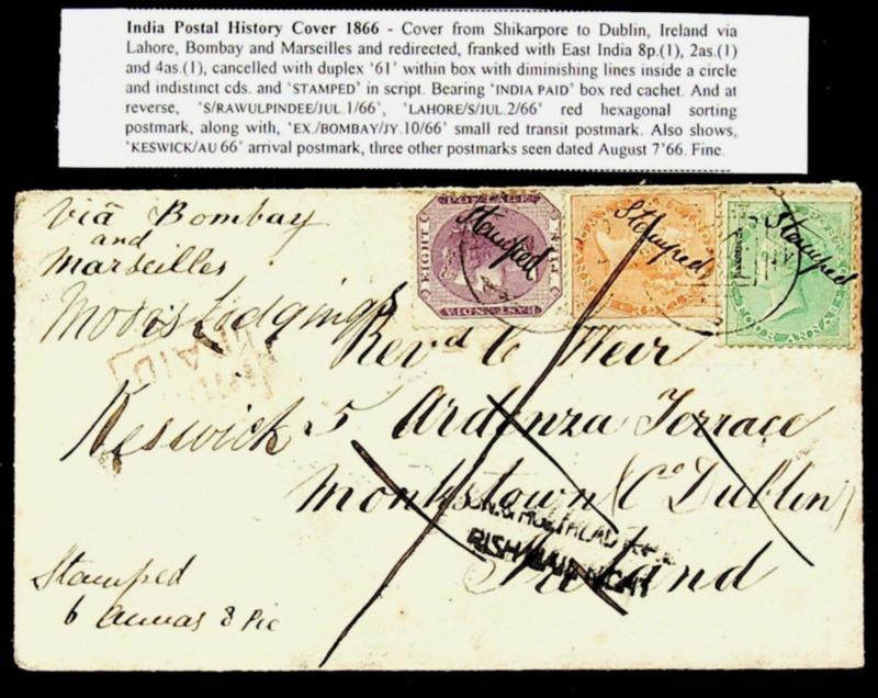 India 1866 QV 3v on cover from Shikarpore via Lahore, Bombay, Marseille France to Ireland & redirected (Image)