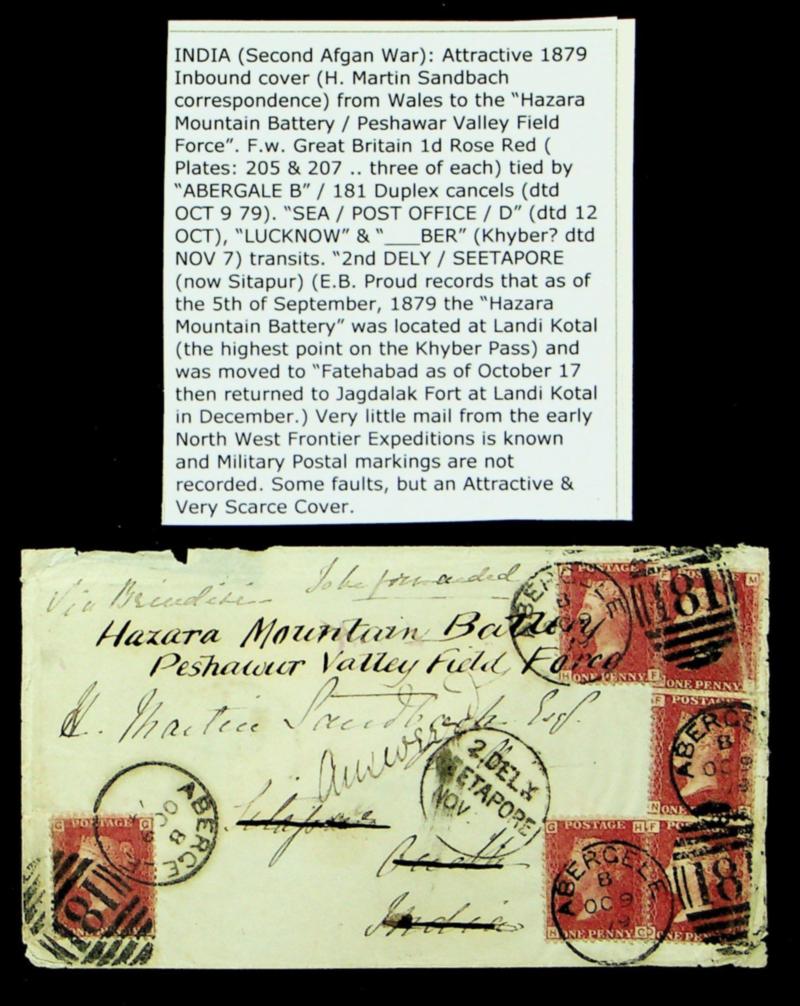 GB 1879 QV 1dx6 rose red tied by duplex cancel on 2nd Afghan War redirected cover from Abergale via Brindisi Italy/ Sea PO to Seetapore India - Very Rare (Image)