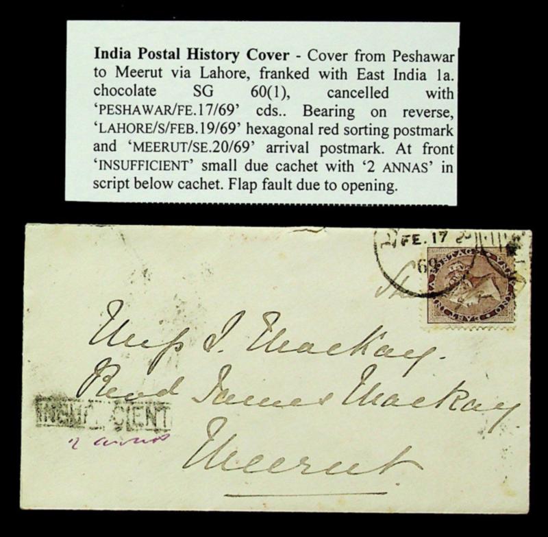 India 1869 QV 1a on cover from Peshawar via Lahore to Meerut w/ boxed "INSUFFICIENT" Due cachet (Image)