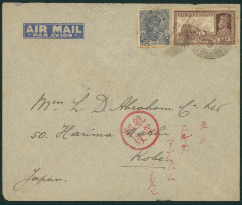 India 3.6A, 4A cancelled by datestamp 1938-02-10 to JAPAN arrival :KOBE 2/19 airmail , letter, (Image1)