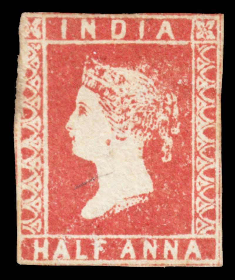 India 1854 9½ arches, ½a vermillion, imperf, wmk part Coat of Arms, prepared for use but not officially issued - without gum as prepared, pen mark and some surface rubbing SG 1 £3500 - 2016 RPSL certificate US$0 (Image)