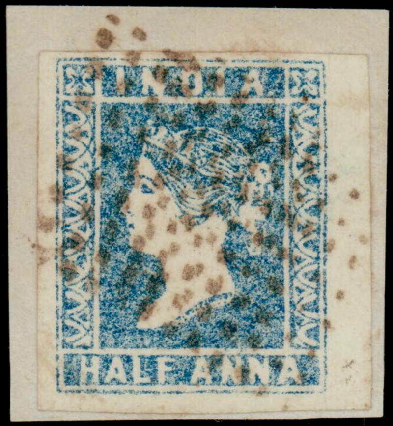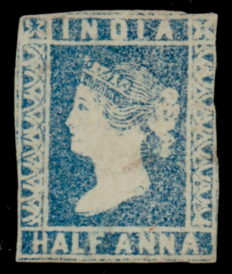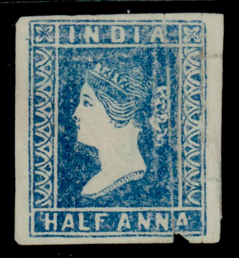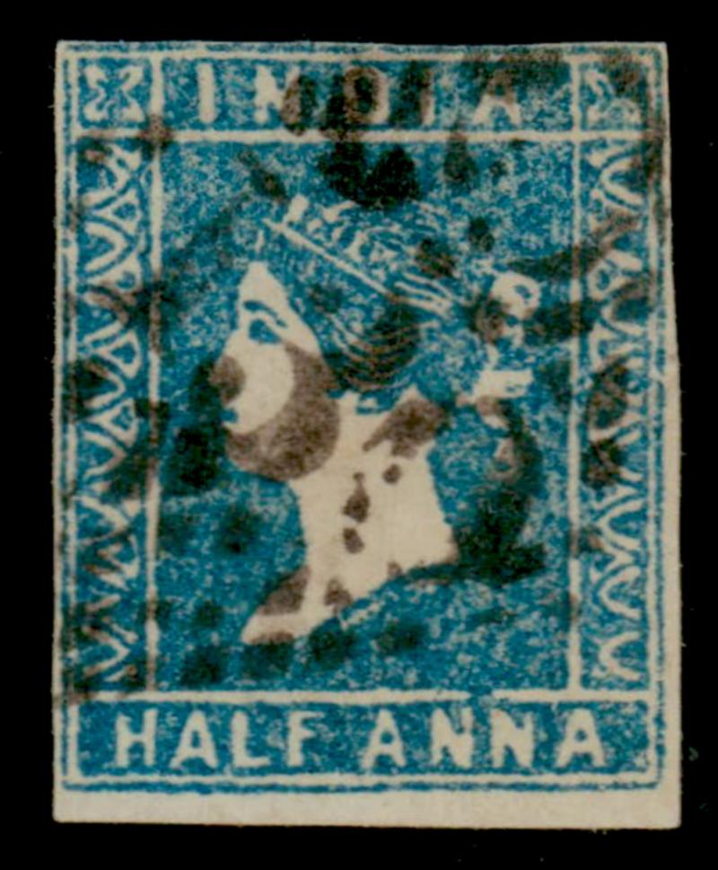 India 1854 QV ½a blue, imperf, die I, unused without gum as issued. SG 6 £275 US$0 (Image)