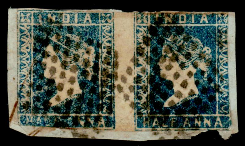 India 1854 ½a imperf, die I (SG 2) pair tied by diamond of dots cancel on small piece US$0 (Image)