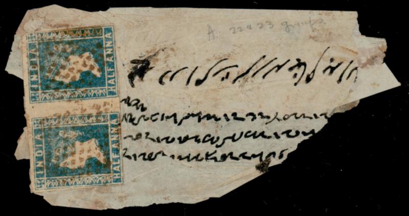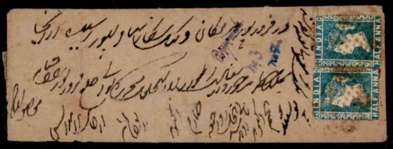 India 1854 ½a blue, imperf, die I, pair used on portion of native envelope from Umritsur. SG 2 £120 US$0 (Image)