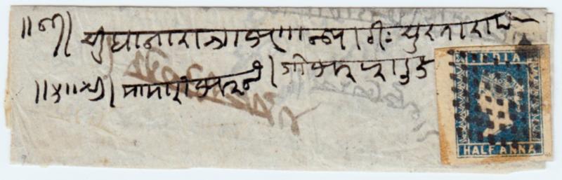 India 1854 ½a pale blue, imperf, die I, mottled print, "INOIA" flaw, cancelled with fine diamond of dots on small piece. SG 3 US$0 (Image)