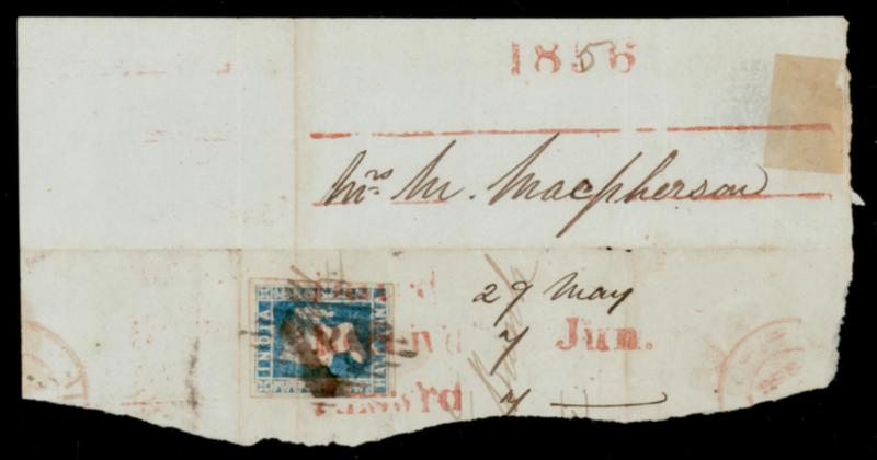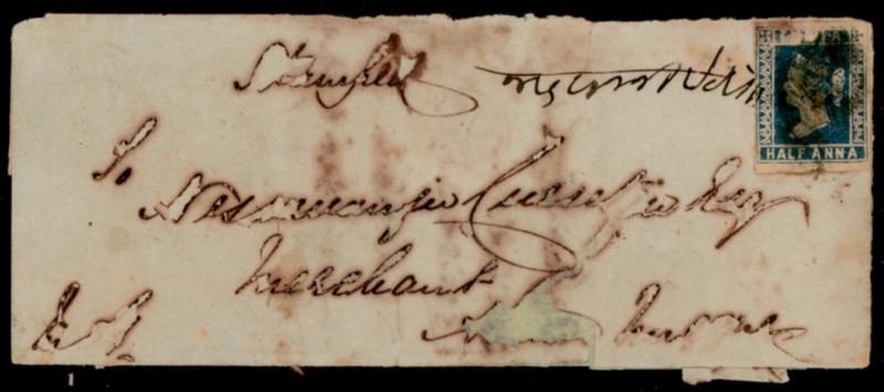 India 1854 ½a pale blue, imperf, die I (SG 3) on 1856 part folded letter tied by Cooper type 5 cancel US$0 (Image)