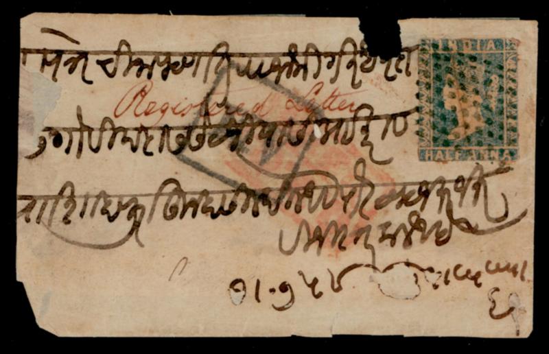 India 1854 ½a pale blue, imperf, die I (SG 3) tied by diamond of dots cancel, on Registered Letter with "BELGAUM Paid 4a Registered Fee (in manuscript)" paid in cash US$0 (Image)