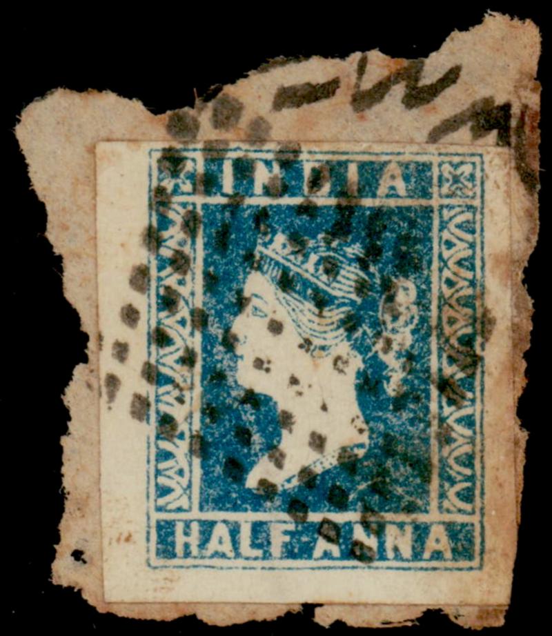India 1854 ½a deep blue, imperf, die I, cancelled with fine diamond of dots on small piece. SG 4 £65 US$0 (Image)