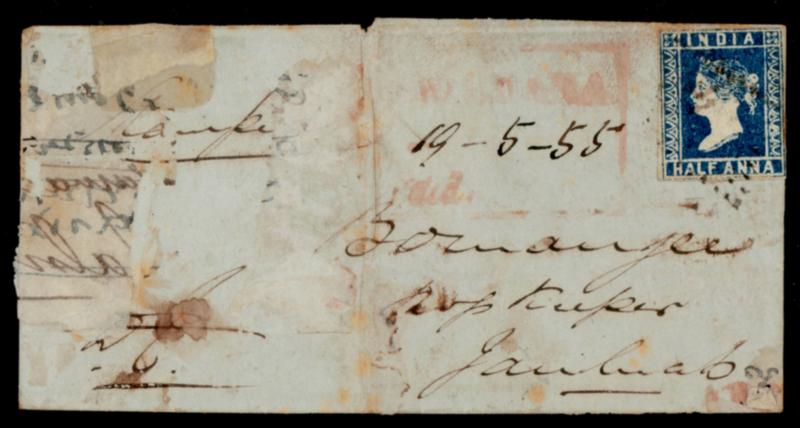 India 1854 ½a deep blue, imperf, die I (SG 4) on 1855 folded letter with boxed JAULNAH Paid on reverse US$0 (Image)