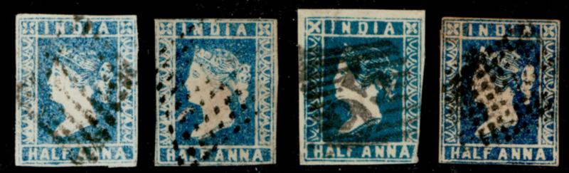 India 1854 ½a blue, imperf, die II, used x 4 shades (4). SG 6/7, minimum catalog £640 US$0 (Image)
