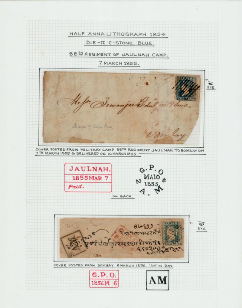 India 1854 ½a blue, imperf, die II on 1855 cover from Military Camp Jaulnah, with type 2 cancel and another cover bearing die II on 1856 cover with diamond of dots cancel. Both stamp with eye retouches US$0 (Image)