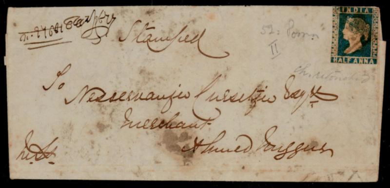 India 1854 ½a indigo, imperf, die II (SG7) with chignon retouched, on fl from POONAH to AHMEDNUGGUR US$0 (Image)