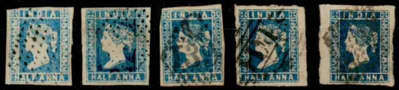 India 1854 ½a blue, imperf (shades) x 5 copies, unchecked for dies US$0 (Image)