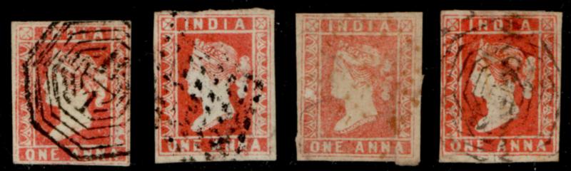 India 1854 1a red, imperf, die I, used x 4 shades (4). SG 11/12, minimum catalog £440 US$0 (Image)