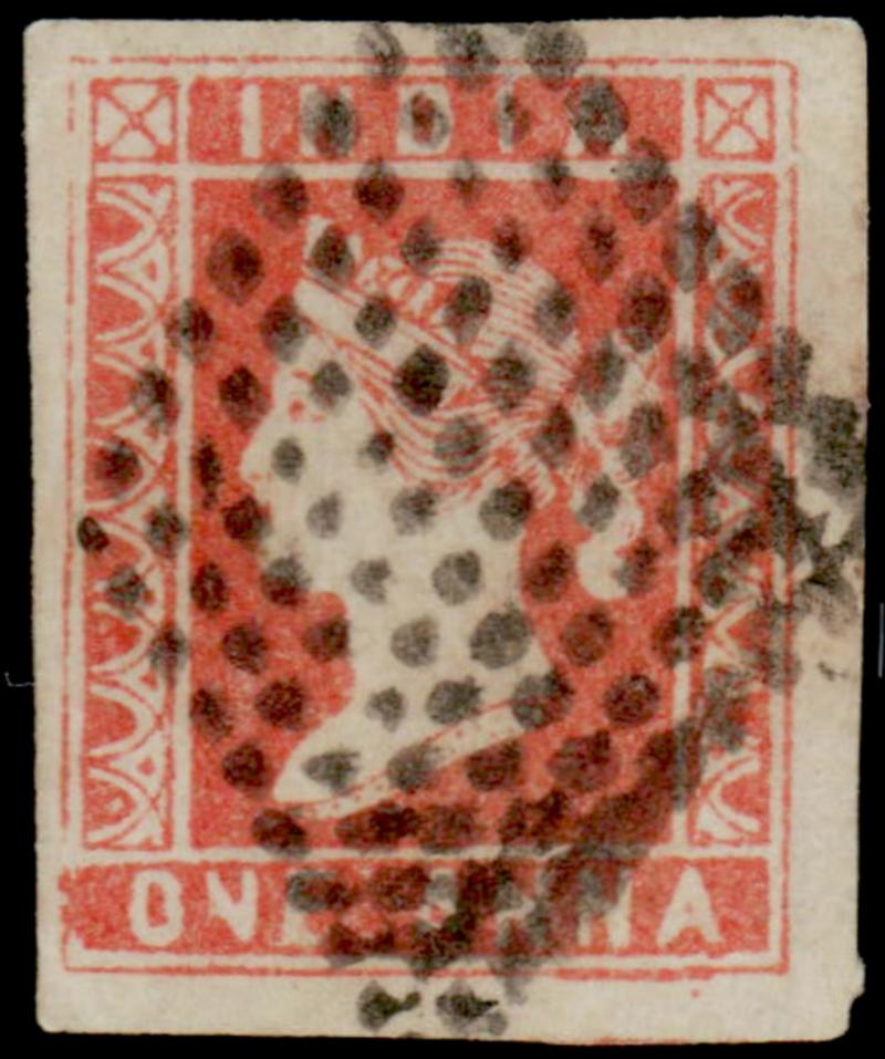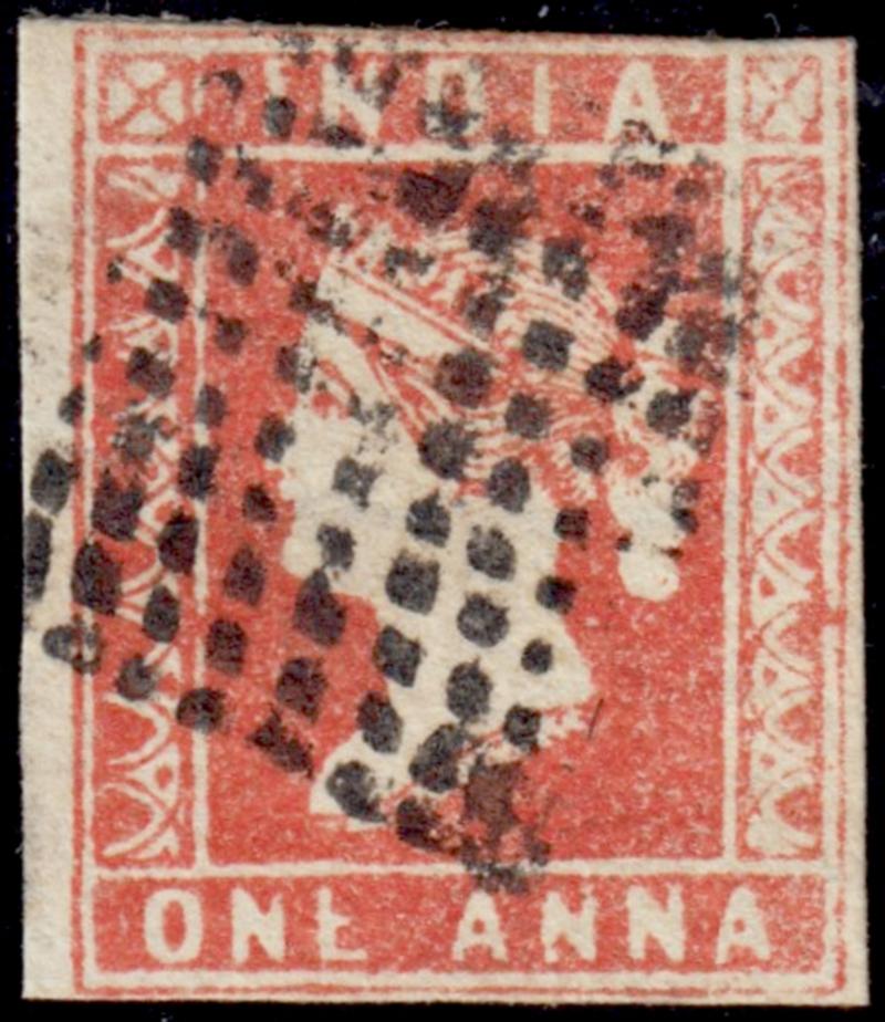 India 1854 1a red, imperf, die I, value tablet extending to frameline and broken "N" of ONE FLAW, cancelled with fine diamond of dots. SG 12 US$0 (Image)