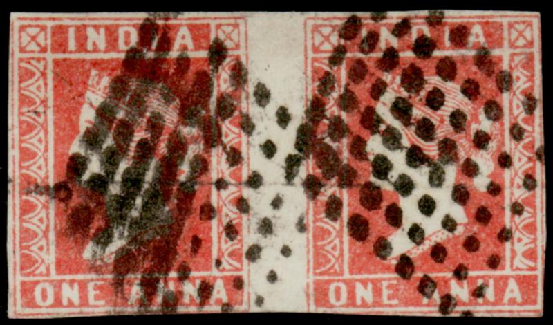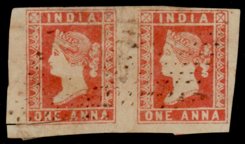 India 1854 1a red, imperf, die I, horizontal pair, cancelled with fine diamond of dots. SG 12 £220 US$0 (Image)