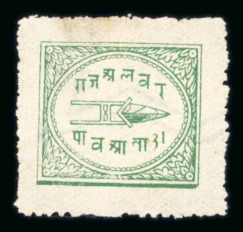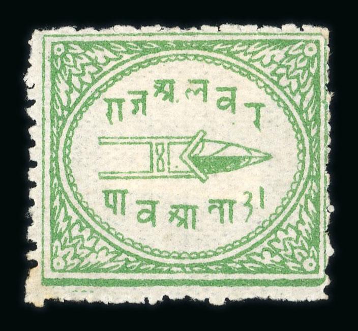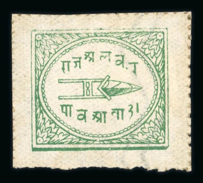 1877-1901 complete collection of Alwar stamps written up on a page, including the scarce ¼ anna wide-margin emerald-green, fine (SG £1350+). (Image)