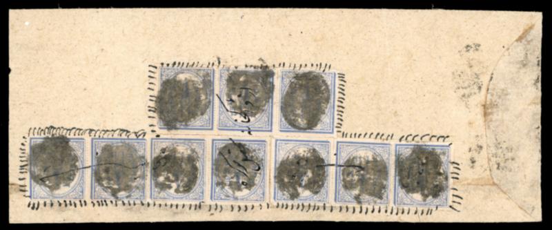 1877 1/4a Steel Blue, ten examples on a native cover showing heavy registered letter rate and all cancelled by intaglio seal cancel and manuscript cancel. Strip of 4, strip of 3 and 3 singles can be seen with rouletted perfs. A striking franking, fine (SG £ 6000). (Image)