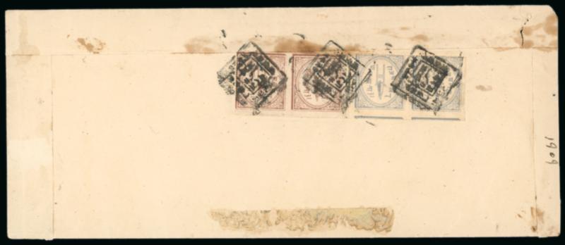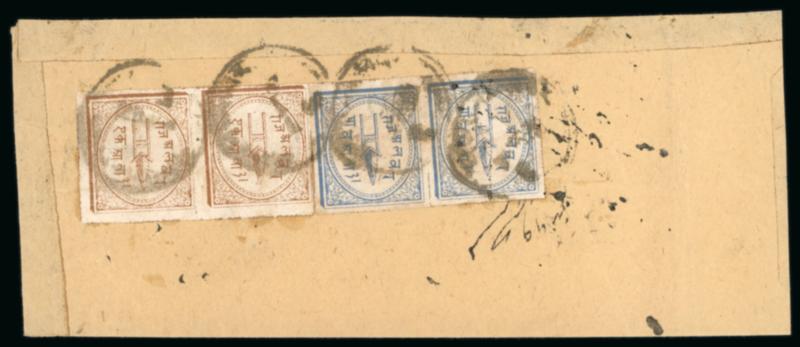 1877 1/4a steel blue vertical pair and 1a pale yellowish brown vertical pair used on large native cover thus paying the heavy weight postage. Scarce multiple franking, very fine (SG £2400). (Image)