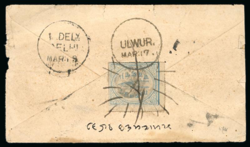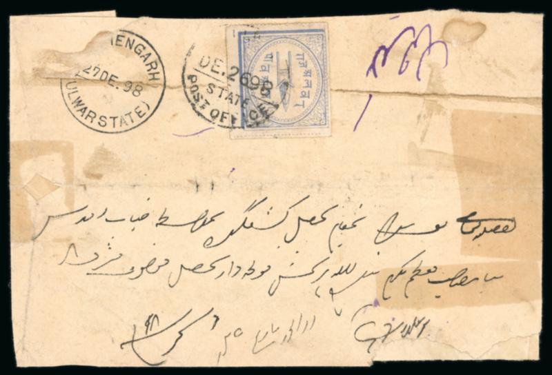1898 Alwar native cover going from Alwar to Kishengarh. Clear circular date stamps of dispatch and receiving at Kishengarh. Ex. Dan Walker (S.G. £60). (Image)