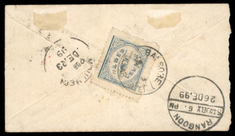 16.12.1899 Imperial combination cover sent from Alwar to Moulmein and then redirected to Rangoon as the addressee had moved. Franked with 1/4a slate blue (SG3, wide margins) posted from Bansore to Imperial office in Alwar (16 Dec 99) to Moulmein (23 Dec 99) to delivery at Rangoon (26 Dec 99). Scarce cover, very fine (SG £ 650). (Image)